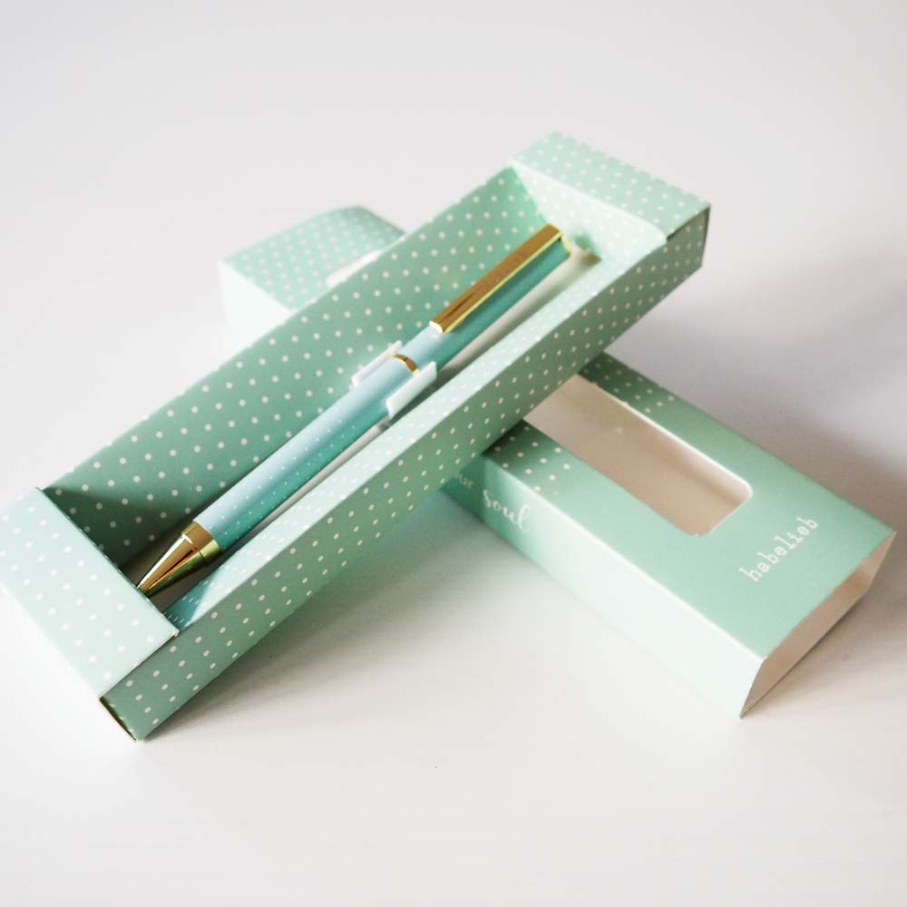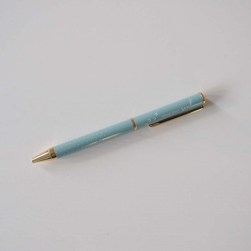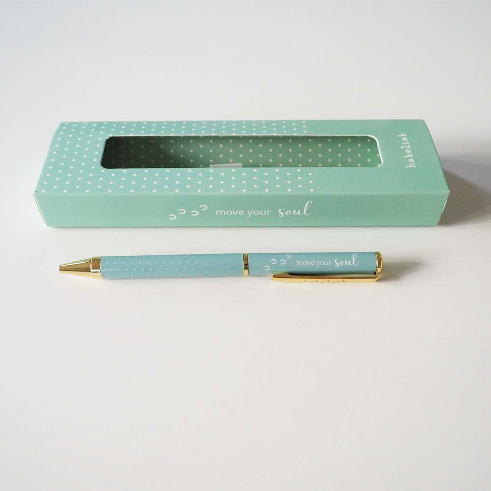 „Move your soul“ und bring all deine Gedanken mit unserem edlen Kugelschreiber zu Papier! Er liegt super in der Hand und ermöglicht dir dadurch eine saubere klare Schrift. Der mintfarbene Kugelschreiber aus Metall ist verziert mit dem schönen Schriftzug „four feet move your Soul“, in dem die Wörter four feet durch vier filigrane Hufabdrücke ersetzt wurden. Durch die goldenen Details und das Punktemuster ist der Stift ein echter Hingucker auf jedem Schreibtisch.